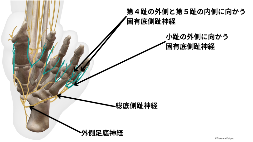 浅枝は小趾に向かう1本の固有底側趾神経(第5趾外側)と1本の総底側趾神経に分かれ、1本の総底側趾神経はその後2本の固有底側趾神経(第5趾内側と第4趾外側)に分かれます。計3本の固有底側趾神経は第4趾の外側縁、第5趾の内・外側の皮膚に分布しています。