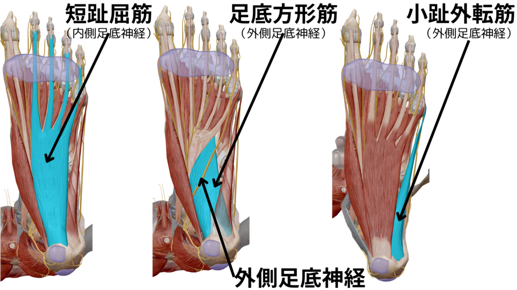 脛骨神経から続く外側足底神経は内くるぶしの後方から足底に向かいます。短趾屈筋と足底方形筋の間を通って外側へ向かい、その間に足底方形筋と小趾外転筋に筋枝を出します。