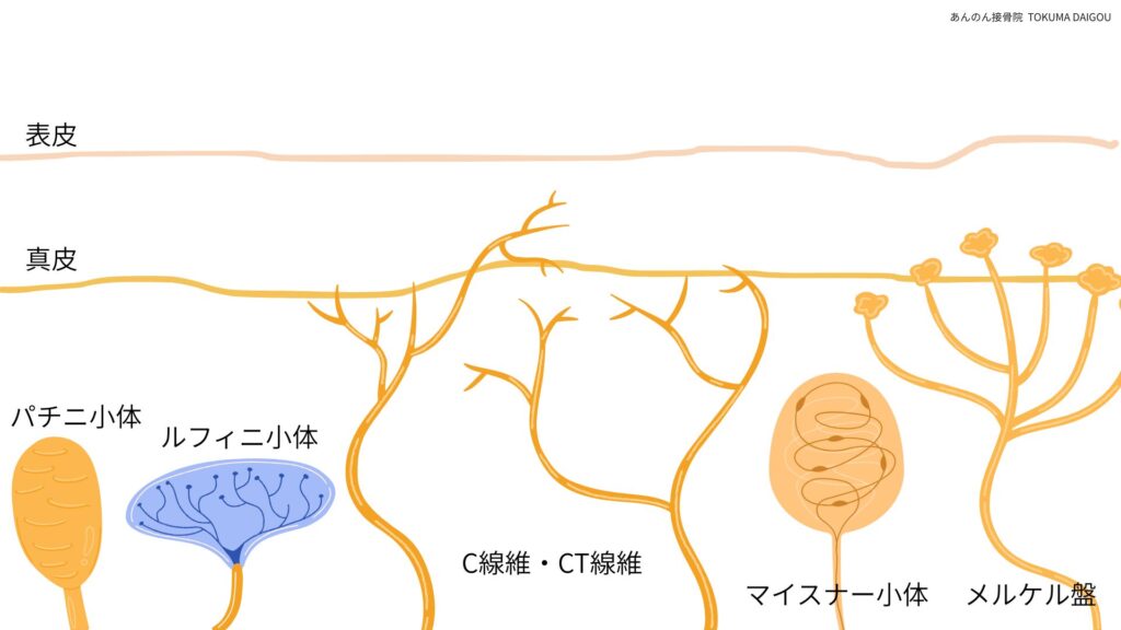 ③パチニ小体:振動やすばやい圧の変化を感知。スマホのバイブもこのセンサーが働いて感じます。