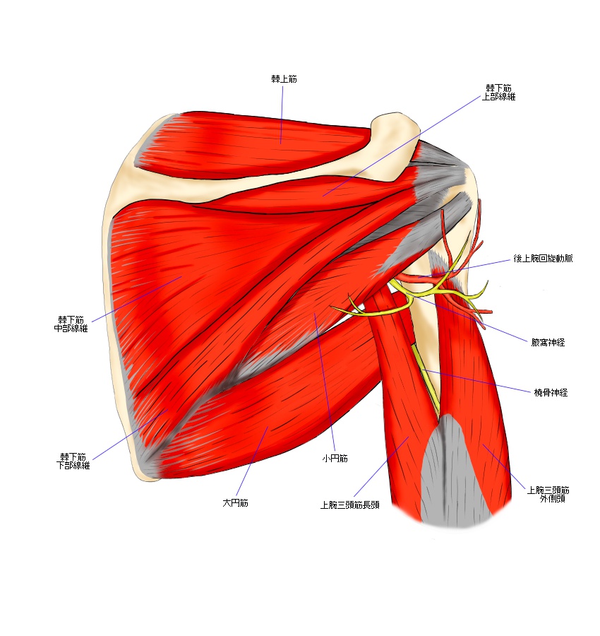 腋窩神経は、首から肩甲骨の裏を通り、上腕骨の周りを回りながら走行します。